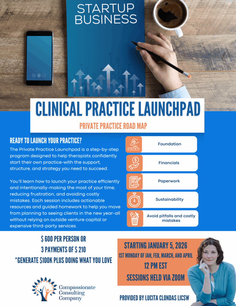 Ready to build a private practice but not sure where to start? The Clinical Practice Launchpad is a live, high-impact program designed to help therapists go from “idea” to “I’m fully booked” with support, structure, and proven strategy.