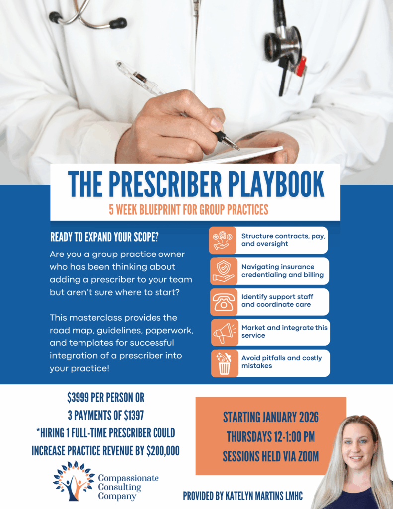 Thinking about adding medication management to your group practice? The Prescriber Playbook is your step-by-step guide to expanding your services the right way, ethically, legally, and profitably.