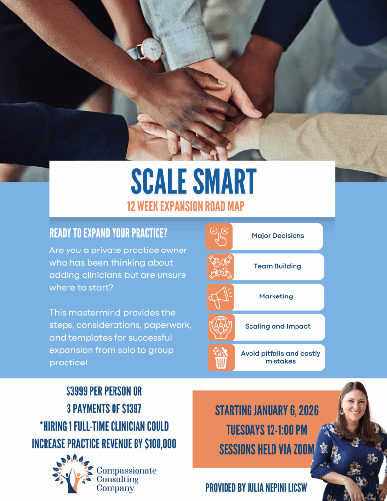 If you’ve been thinking about hiring clinicians but feel stuck on where to start (or what to do next), the Scale Smart mastermind was built for you. This 12-week experience gives you everything you need to expand your private practice with intention, clarity, and confidence. Adding just one full-time clinician can increase your practice revenue by $100,000+ per year, but only if you do it right. This program helps you avoid expensive mistakes and lead your team with strategy, not stress.